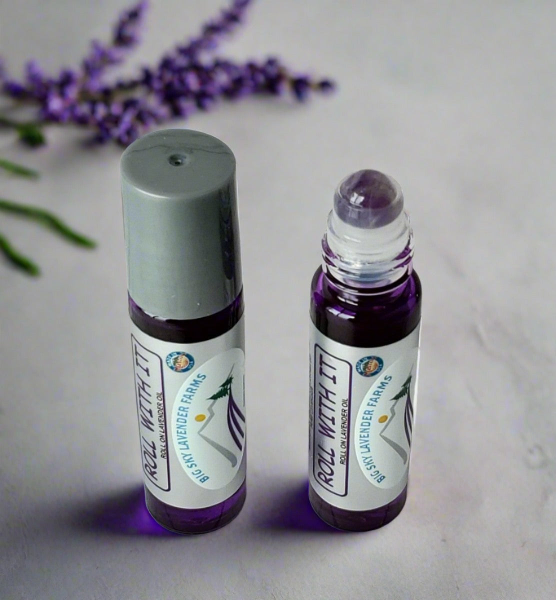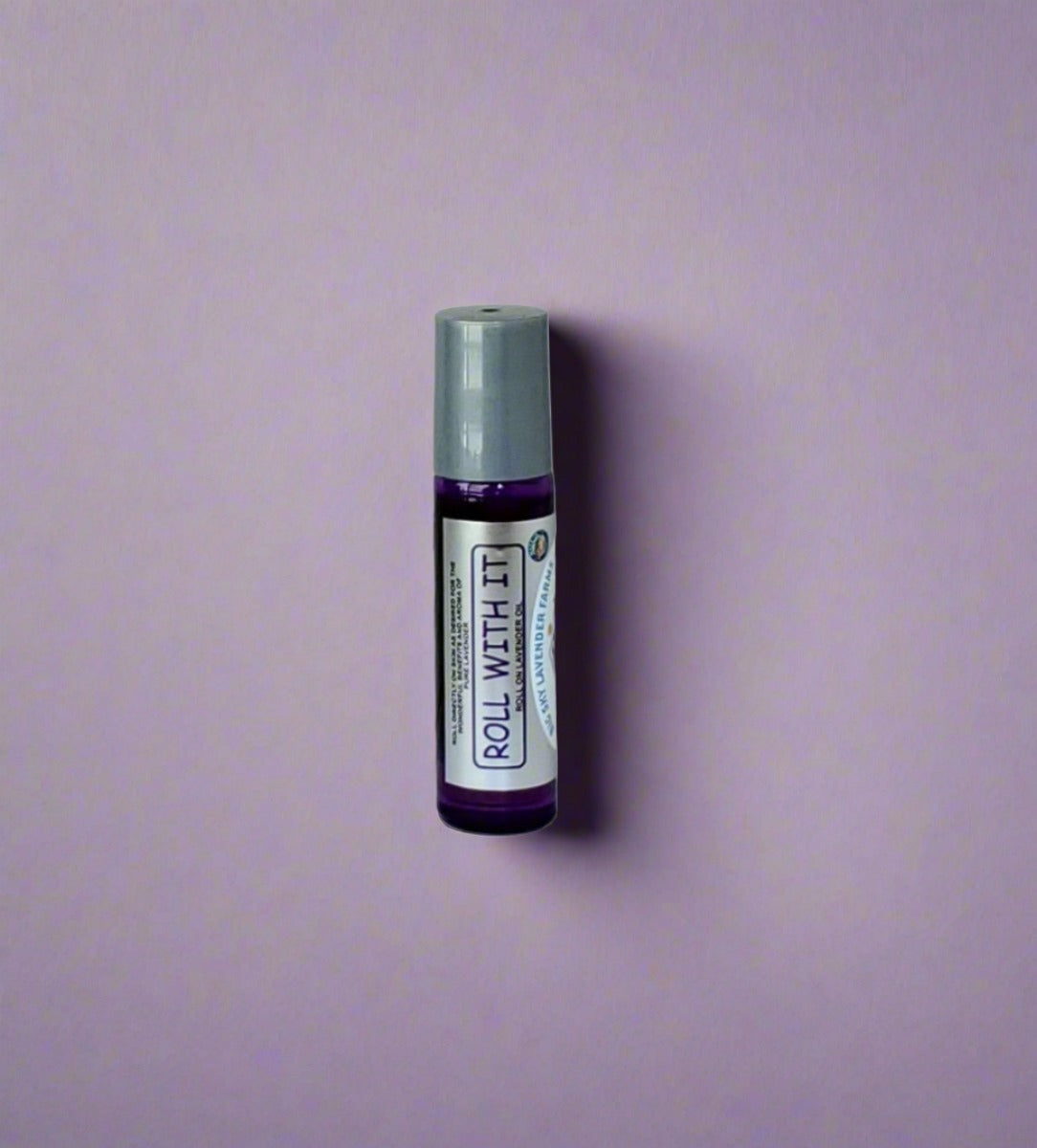 Roll With It lavender oil comes in a 10 ml purple glass bottle with an amethyst rollerball.